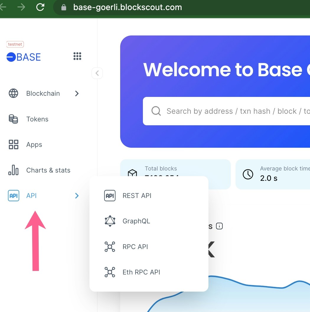 API information can be accessed from the Blockscout main menu, footer or header depending on the instance. Blockscout supports several methods:- REST API: API that serves the UI for Blockscout.