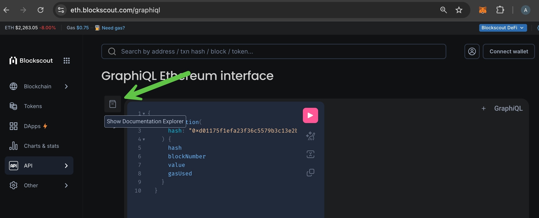 To access Blockscout GraphQL interface you can use GraphiQL - in-browser IDE for exploring GraphQL. It’s built in to Blockscout. From the APIs dropdown menu choose GraphQL.