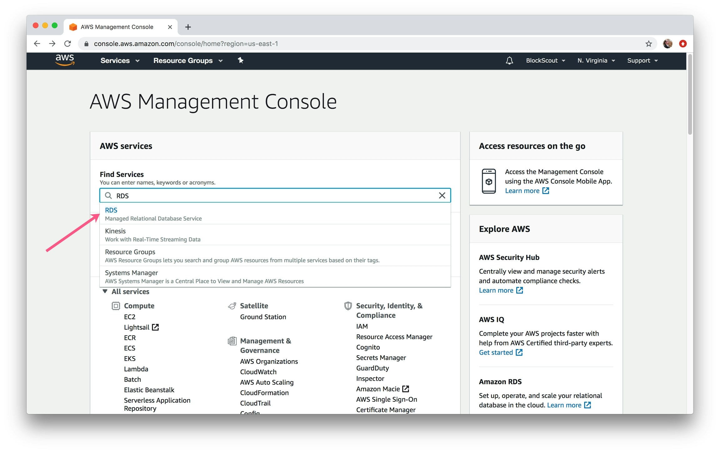 1) In the Find Services box, type in RDS and select.