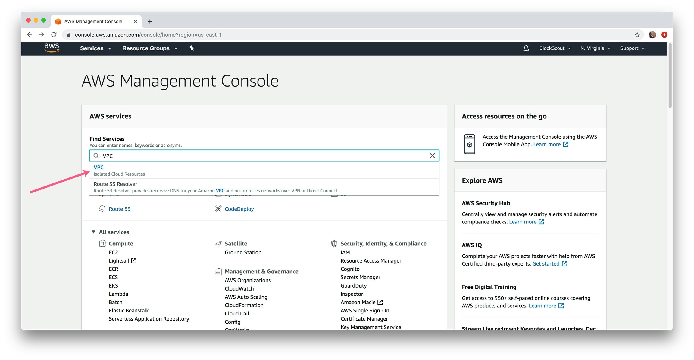 1) In the Find Services box, type in VPC and select.