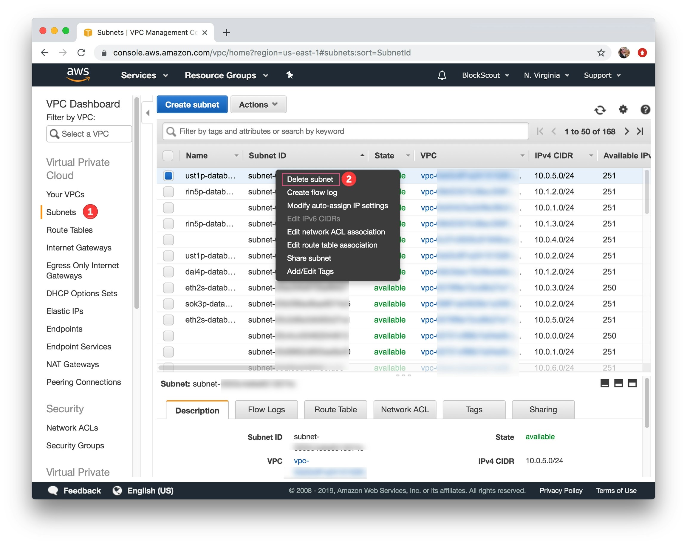 Select subnet to delete, right click, select Delete subnet and confirm deletion.