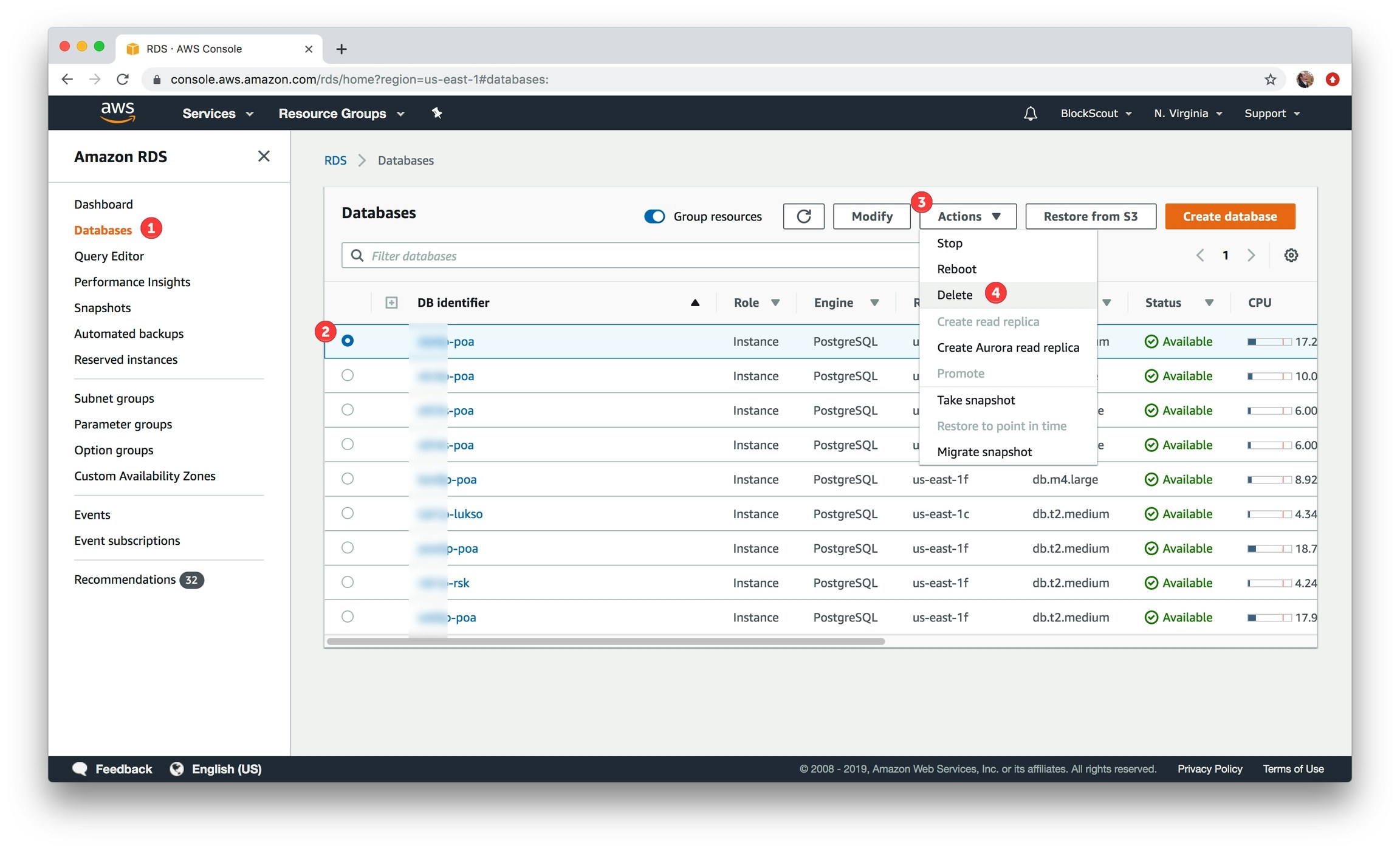 Go to Databases, select the DB to delete, click the Actions menu and select Delete.
