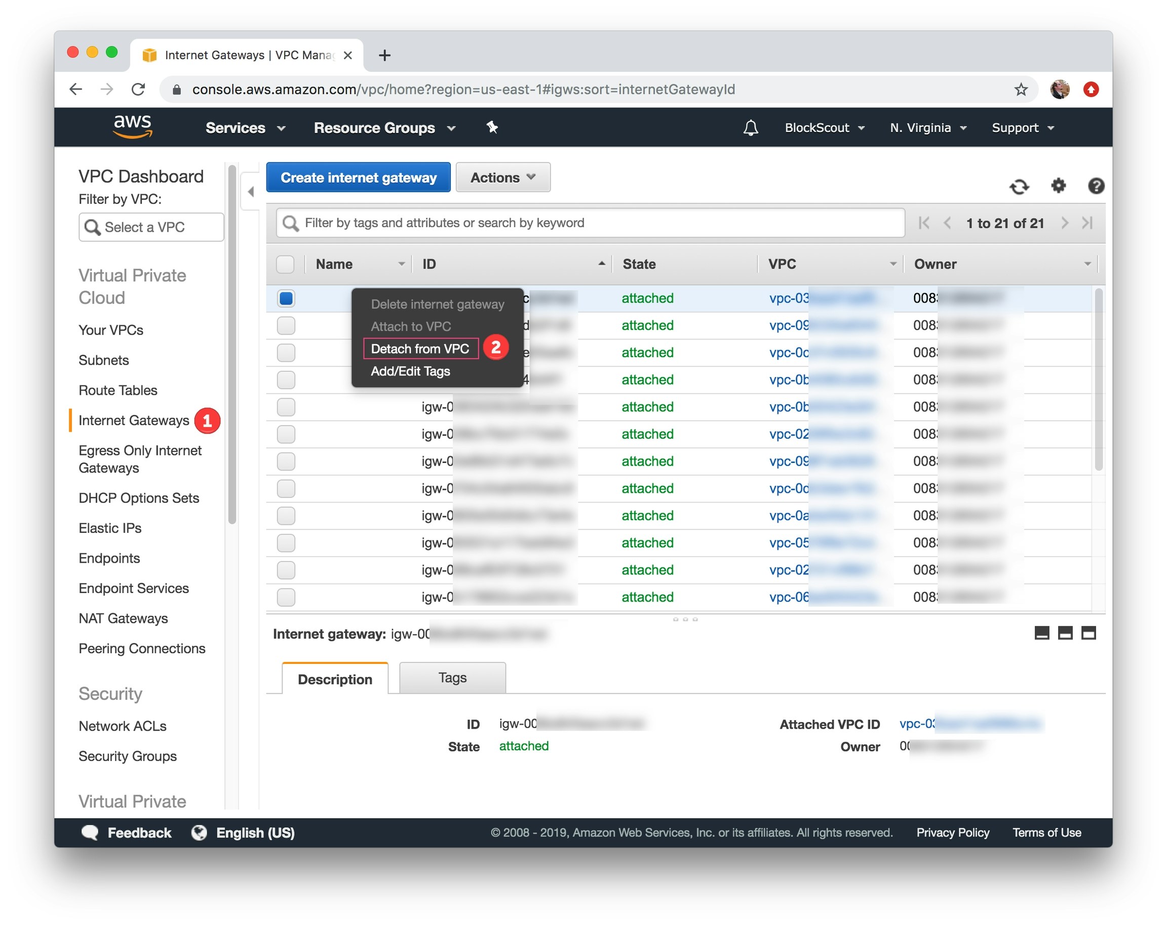 Select internet gateway to detach, right click, select Detach from VPC and confirm.