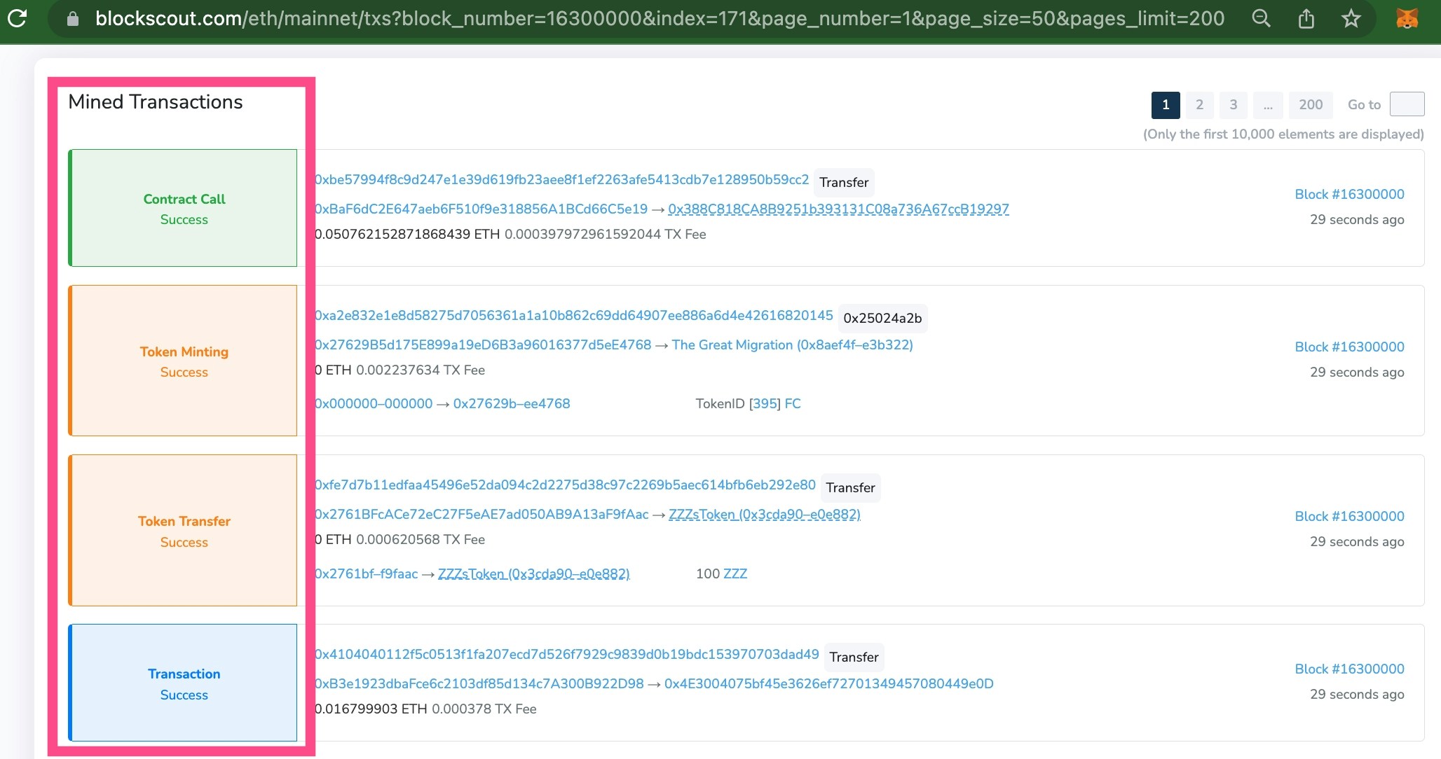 - Transaction: A contract call where the contract has not yet been identified by Blockscout.